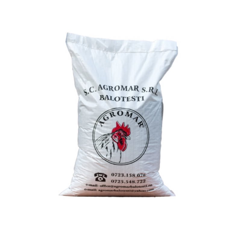 Compoziție: Grâu, porumb, șrot de soia, șrot de foarea soarelui, carbonat de calciu, premix vitamino -mineral, ulei de floarea soarelui, fosfat monocalcic, sare.