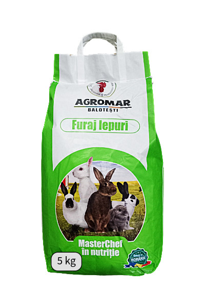 Furaj iepuri Utilizare: Se administrează ca furaj complet în hrana iepurilor. Nivel de proteina: 17 % Compoziție: Porumb, grâu, orz, tărâțe de grâu, ulei de floarea soarelui, șrot de floarea soarelui, premix vitamino-mineral, carbonat de calciu, fosfat monocalcic, sare. Mod de ambalare: 5 kg. hârtie , 10 kg. hârtie . Mod de prezentare: granulă Furajul pentru iepuri este destinat furajării animelelor din sistemele gospodărești și semiintensive de creștere. In cazul in care se folosește ca furaj unic, rația trebuie suplimentată cu furaje vegetale (fân de lucernă, paie etc). Se poate folosi și în hrana altor animele de blană ca furaj complementar.