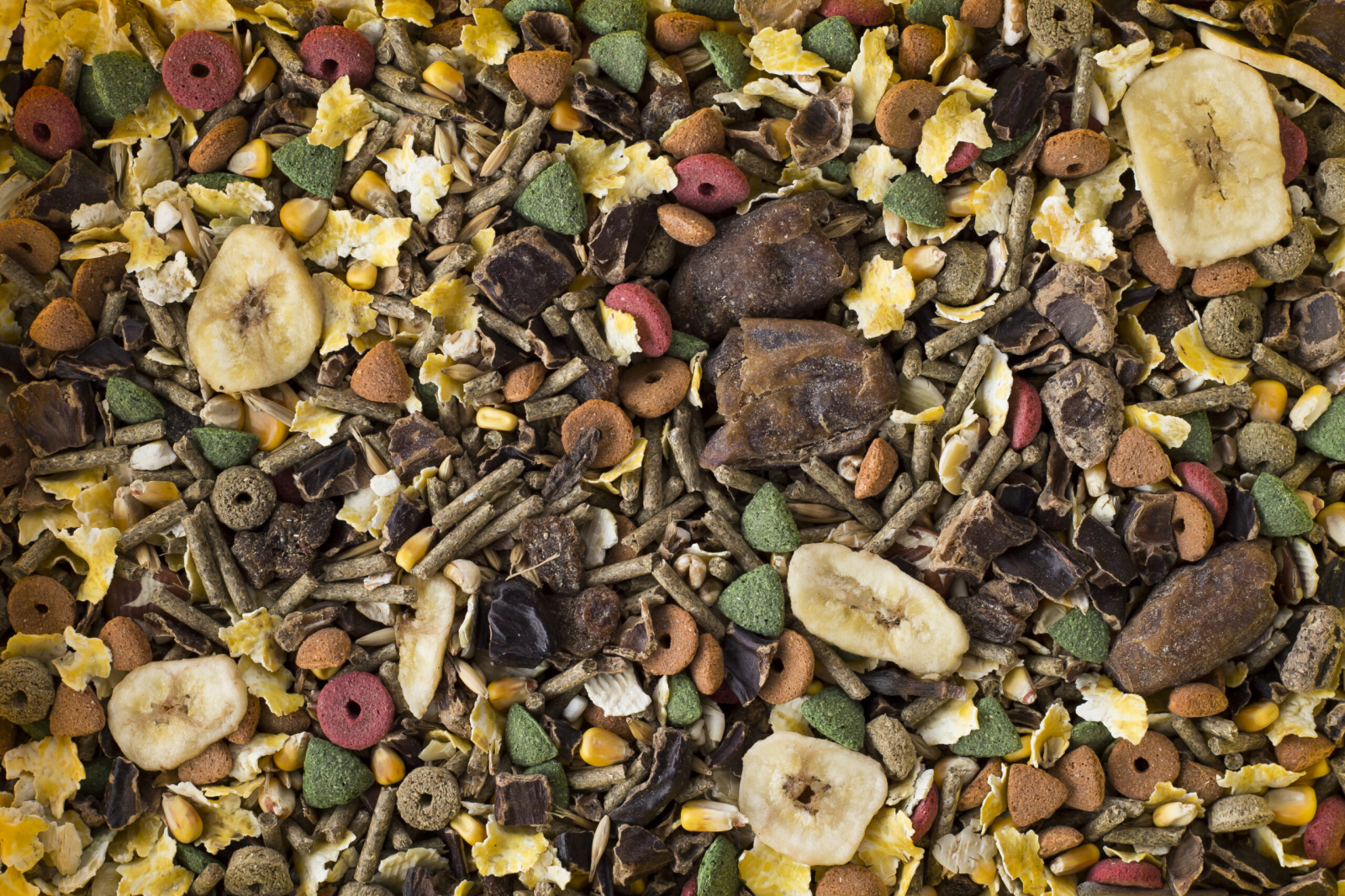 Ingrediente: Medic (Alfa-Alfa), Orz, Porumb, Roșcove, Crochete colorate din cereale și legume (sfeclă roșie), Fulgi de porumb, Grâu, Ovăz, Orez expandat, Sorg roșu, Orez nedecorticat, Fructe uscate, Fulgi de mazăre, Fulgi de fasole, Curmale, Stafide, Smochine, Chipsuri de banane.